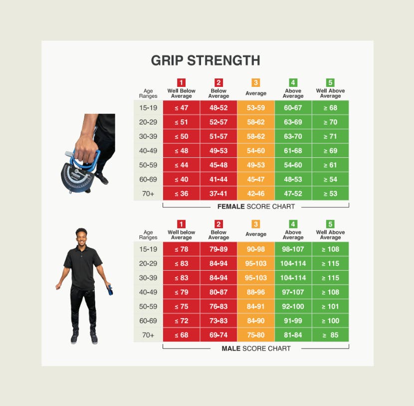Medcan recommends aiming for above average or higher scores, as these are linked to reduced chronic disease risk and improved functional independence. Post-test interventions often include structured resistance training 2–3 times per week, focusing on full-body strength and grip-specific exercises like rows, carries, and curls.
